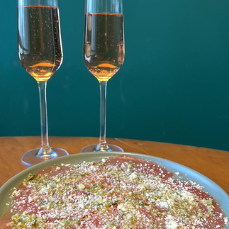 Carpaccio de carne com crostini, acompanhados por um espumante especialmente selecionado para abrir o apetite.